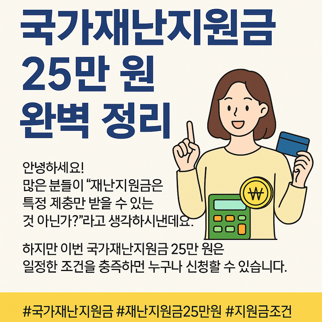 안녕하세요! 많은 분들이 “재난지원금은 특정 계층만 받을 수 있는 것 아닌가?”라고 생각하시는데요. 하지만 이번 국가재난지원금 25만 원은 일정한 조건을 충족하면 누구나 신청할 수 있습니다. 갑작스러운 경기 침체나 생활비 부담으로 힘들어하는 국민들을 지원하기 위한 제도인데요. 오늘은 헷갈리기 쉬운 지원금 조건과 신청 방법을 쉽게 풀어드리겠습니다.✅ 1. 누구나 받을 수 있나요?결론부터 말씀드리면, 소득과 자산 기준을 충족하면 가능합니다!정부는 중산층·서민 가계의 생활 안정을 위해 재난지원금을 마련했는데요. 단, 고소득자나 고액 자산 보유자는 지원 대상에서 제외됩니다.👉 “나는 해당 안 되겠지…” 하고 미리 포기하지 마시고, 조건만 맞는지 꼼꼼히 확인해보시는 게 좋습니다.✅ 2. 지원금 지급 조건은?국가..