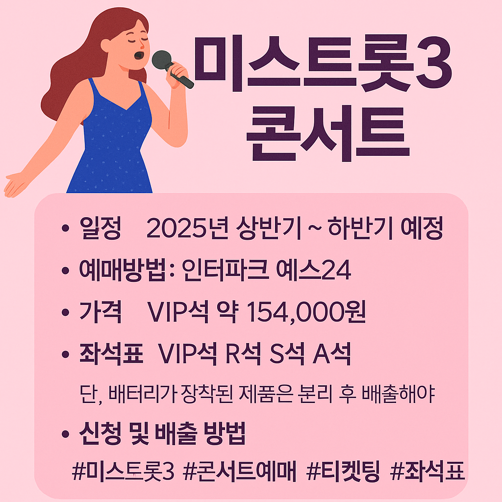 트로트 팬이라면 놓칠 수 없는 소식! 바로 미스트롯3 콘서트입니다. 전국에서 펼쳐지는 화려한 무대와 다양한 출연진이 함께하는 이번 콘서트는 티켓팅 경쟁이 치열할 것으로 예상되는데요. 오늘은 일정, 예매방법, 가격, 티켓팅 꿀팁, 좌석표까지 한눈에 정리해 드리겠습니다.🎶 미스트롯3 콘서트 일정공연 기간 : 2025년 상반기 ~ 하반기 예정지역 투어 : 서울, 부산, 대구, 광주, 대전, 수원 등 전국 주요 도시첫 공연 : 서울 올림픽공원 체조경기장(예정)👉 도시별 일정은 순차적으로 공개되니, 공식 예매처 공지 확인이 필요합니다.🎫 미스트롯3 콘서트 예매방법미스트롯3 콘서트는 주로 인터파크 티켓, 티켓링크, 예스24 공연 등에서 단독 예매를 진행합니다.사전예매(팬클럽 전용) : 공식 팬클럽 가입자 우선..