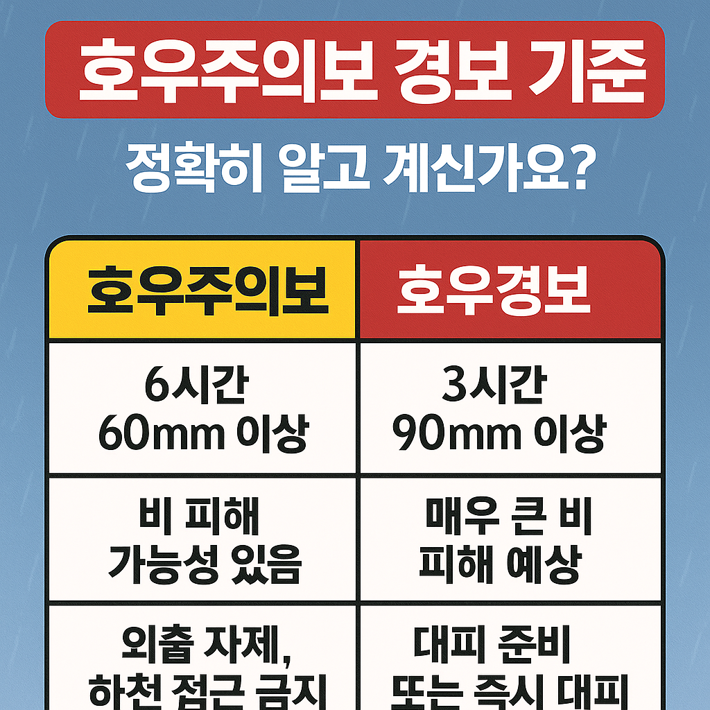 기상청에서 내리는 호우주의보·호우경보,뉴스에서는 자주 듣지만 실제 어떤 기준으로 발효되는지 잘 모르시겠죠?기준을 정확히 알고 있어야 재난 대비도 철저히 할 수 있습니다.오늘은 호우주의보 경보 기준과 행동 요령을 핵심만 콕 짚어 알려드립니다.1️⃣ 호우주의보 경보 기준은 어떻게 나뉘나요?호우 특보는 크게 호우주의보와 호우경보로 나뉩니다.구분발효 기준호우주의보6시간 강우량이 60mm 이상 예상되거나, 누적 강우로 피해가 우려될 때호우경보3시간 강우량이 90mm 이상, 또는 12시간 180mm 이상 등 매우 강한 비가 예상될 때 📌 상황에 따라 지역별 기준이 일부 달라질 수 있으며, 기상청 판단에 따라 조정 발령되기도 합니다.2️⃣ 호우주의보 경보 기준의 핵심 차이점은?주의보 vs 경보, 무엇이 다를까?항목..