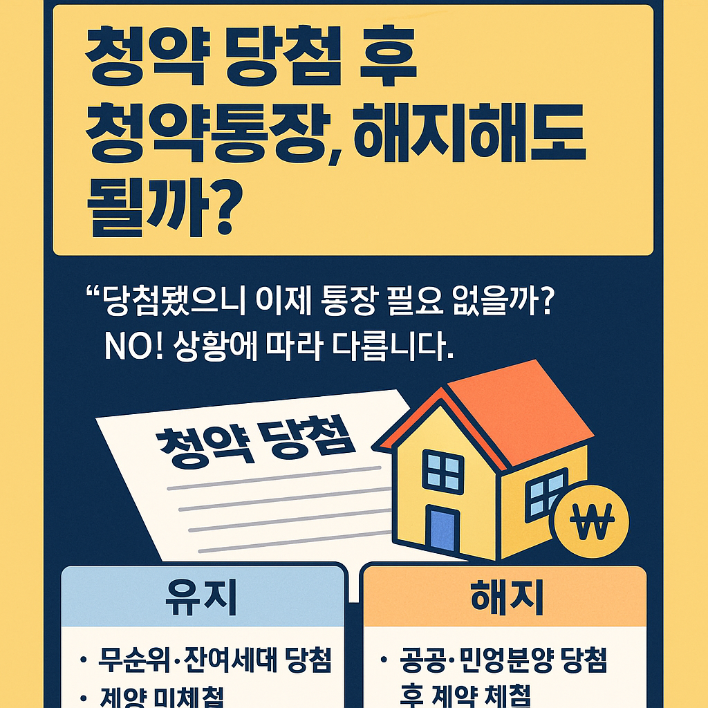 “당첨됐으니 이제 통장 필요 없을까?NO❗ 상황에 따라 다릅니다.”청약에 당첨된 뒤 가장 많이 하는 질문 중 하나가 바로👉 “이제 청약통장 해지해도 되나요?” 입니다.하지만 청약 통장은 단순한 ‘당첨용 통장’이 아니라,주택 정책·재당첨·세대원 활용 등 다양한 조건이 걸려 있습니다.지금부터 당첨 후 청약통장 유지 필요성과 해지 조건별 주의사항을 정리해드릴게요.🧾 1️⃣ 청약통장이란?청약통장은 내 집 마련을 위한 ‘주택청약저축’ 계좌로,청약 시점의 가입기간·납입횟수·잔액 등에 따라아파트 당첨 우선순위가 결정됩니다.구분내용🔸 상품명주택청약종합저축🔸 운영기관은행(우리·국민·신한·농협 등) / 국토교통부 관리🔸 가입대상대한민국 국민 누구나 (세대주·세대원 모두 가능)🔸 주요용도공공·민영주택 청약 신청 ..