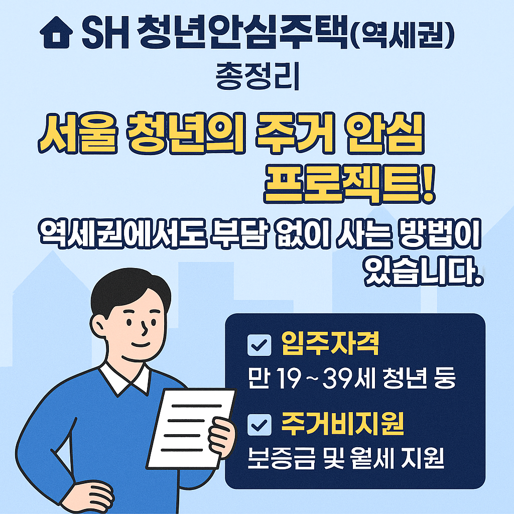 “서울 청년의 주거 안심 프로젝트!역세권에서도 부담 없이 사는 방법이 있습니다.”서울의 높은 전·월세 부담 때문에청년 1인 가구의 주거 불안이 커지고 있죠.이런 문제를 해결하기 위해서울시와 SH공사가 함께 운영하는 제도가 바로👉 **“청년안심주택(역세권)”**입니다.🚇 1️⃣ SH 청년안심주택(역세권)이란?역세권 청년안심주택은서울시가 청년층(19~39세)을 대상으로역세권 주변 주택을 임차해 저렴하게 재공급하거나신축형 공공임대주택을 직접 제공하는 사업이에요.구분내용🔸 제도명서울시 SH 청년안심주택(역세권 청년주택)🔸 운영기관서울특별시 · 서울주택도시공사(SH)🔸 대상청년(만 19세~39세), 신혼부부, 대학생 등🔸 유형민간임대형 / 공공임대형 (두 가지)🔸 목적역세권 내 저렴한 임대주택 공급 ..