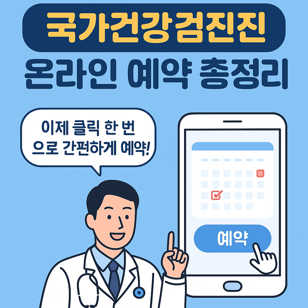 “이제 병원 방문 없이도 클릭 한 번으로 건강검진 예약!”💡 1️⃣ 국가건강검진이란?국가건강검진은국민의 건강을 지키기 위해 국민건강보험공단이무료 또는 저렴한 비용으로 제공하는 건강검진 제도입니다.구분내용시행기관국민건강보험공단 (NHIS)대상만 20세 이상 성인 (가입자 및 피부양자)비용무료 (일부 항목 본인부담 있음)검진주기일반검진 2년마다 1회, 암검진 매년 또는 2년마다예약방법온라인, 전화, 병원 방문💬 국가에서 지원하는 만큼, 반드시 정기적으로 받는 게 좋아요!📋 2️⃣ 국가건강검진 대상자 확인✅ (1) 일반건강검진직장가입자·지역가입자·피부양자 모두 대상홀수/짝수년도 출생자 기준으로 번갈아 시행예) 2025년 검진 대상자 → 홀수년도 출생자 (1981, 1993, 1995 등)✅ (2) 암검진..